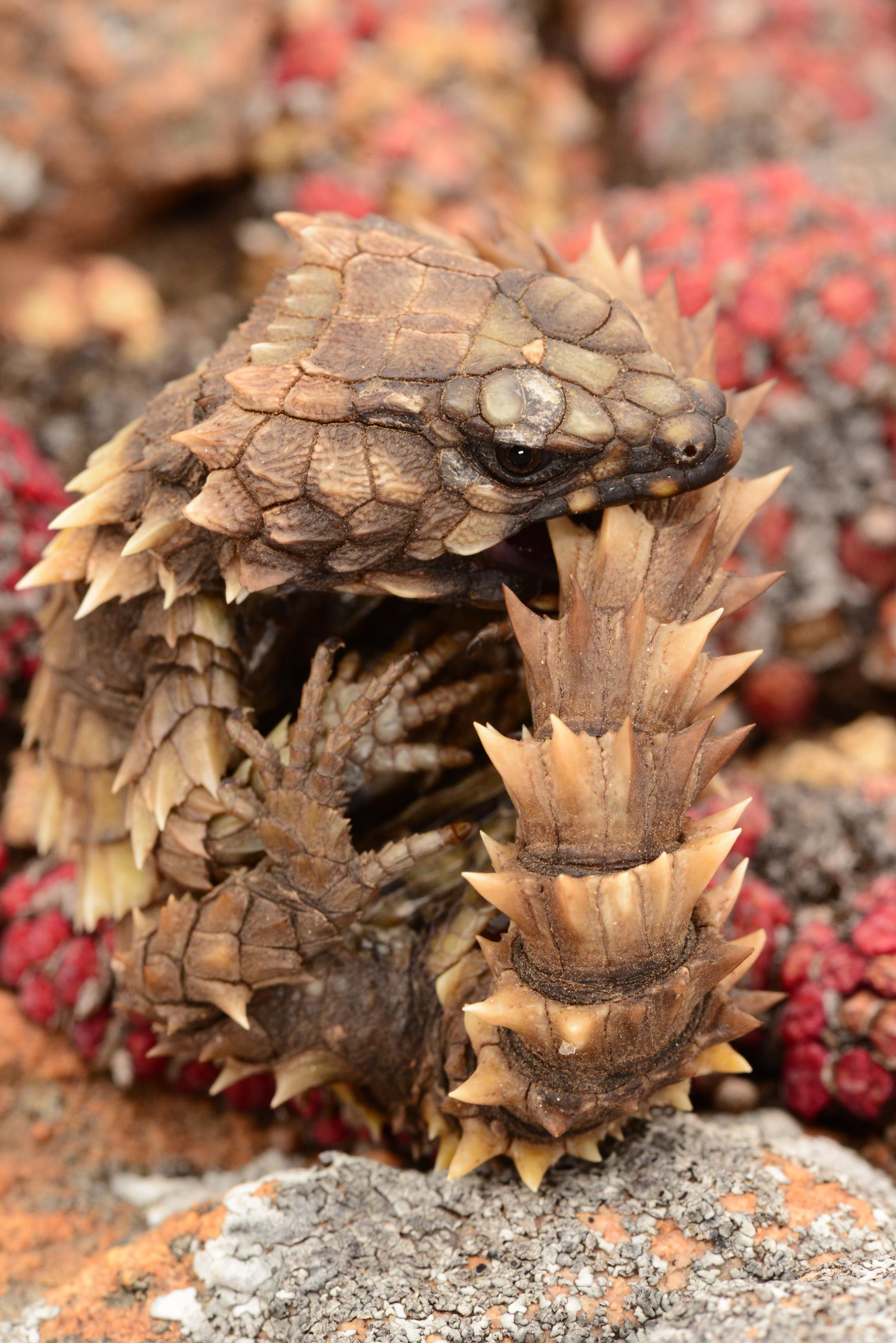 A photograph of an Armadillo Girdled Lizard (Ouroborus cataphractus) taken in South Africa. The lizard is in its defensive posture (© Johannes Els)