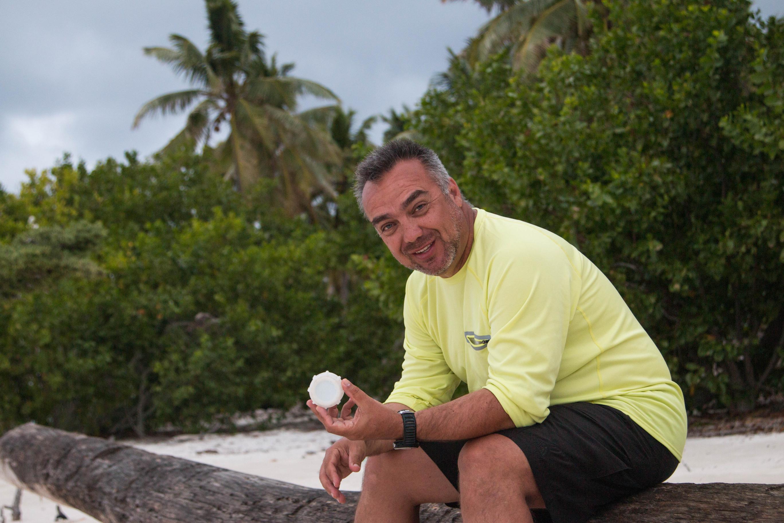 Edgardo Ochoa with a plastic bottle cap found in the waters surrounding the Lau Islands in Fiji (© CONSERVATION INTERNATIONAL/KATIE BRYDEN)