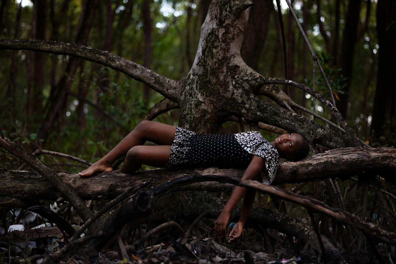 Jessica Higgins has lived her whole life in a wood barrack in a mangrove area. She lives in Plastic city, an out of sight shanty town located at the mouth of the Demerara River and inside a mangrove forest, where people live among mangroves and garbage. This was the first time she climbed a mangrove root.