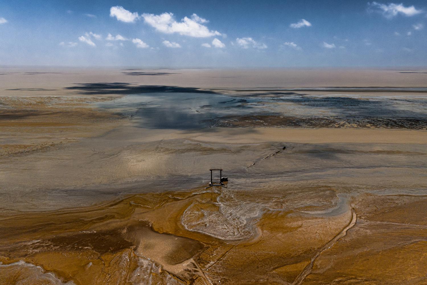 An ancient deactivated koker, as sluices or floodgates are called in Guyana, is seen over a mudbank. The sea line has been displaced due to the advances of the ocean towards the city of Georgetown and the old koker stands alone and far from the current coast line.