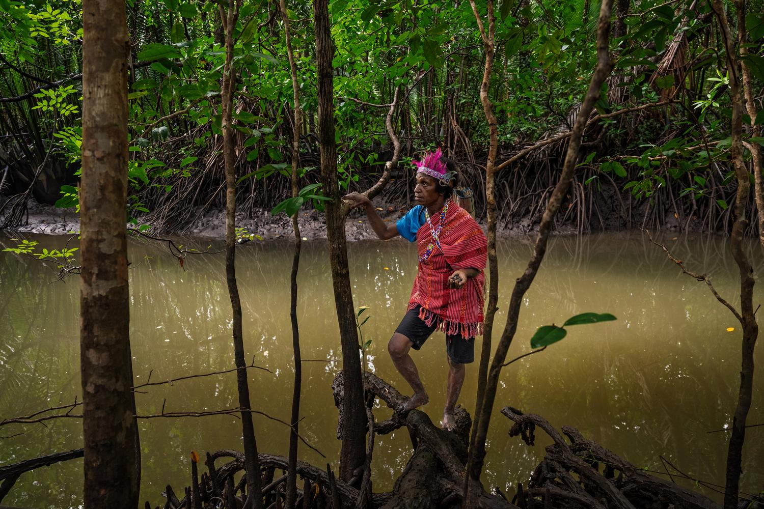 Amidst the gnarled roots of the mangrove forests lies a hidden world teeming with life. These resilient ecosystems serve as nature's pantry, offering a bounty of seafood and resources that sustain local communities. Here, Fransina Sianggo surveys the landscape, looking for crabs and snails hidden in the trees.