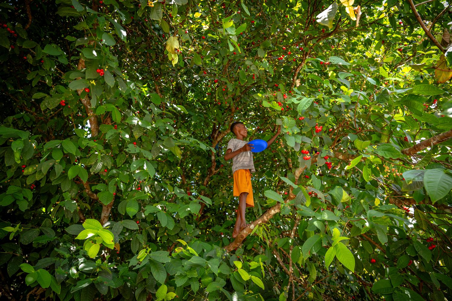 In the heart of Nakna Village, Nelci Meres — bearing his sub-tribe's name — climbs a water apple tree just meters from his home.