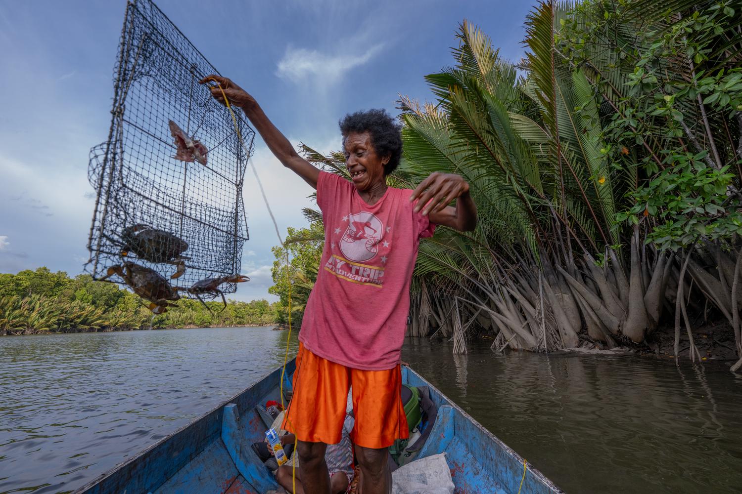 Fransina Sianggo excitedly pulls out a trap covered in crabs from nearby mangroves.